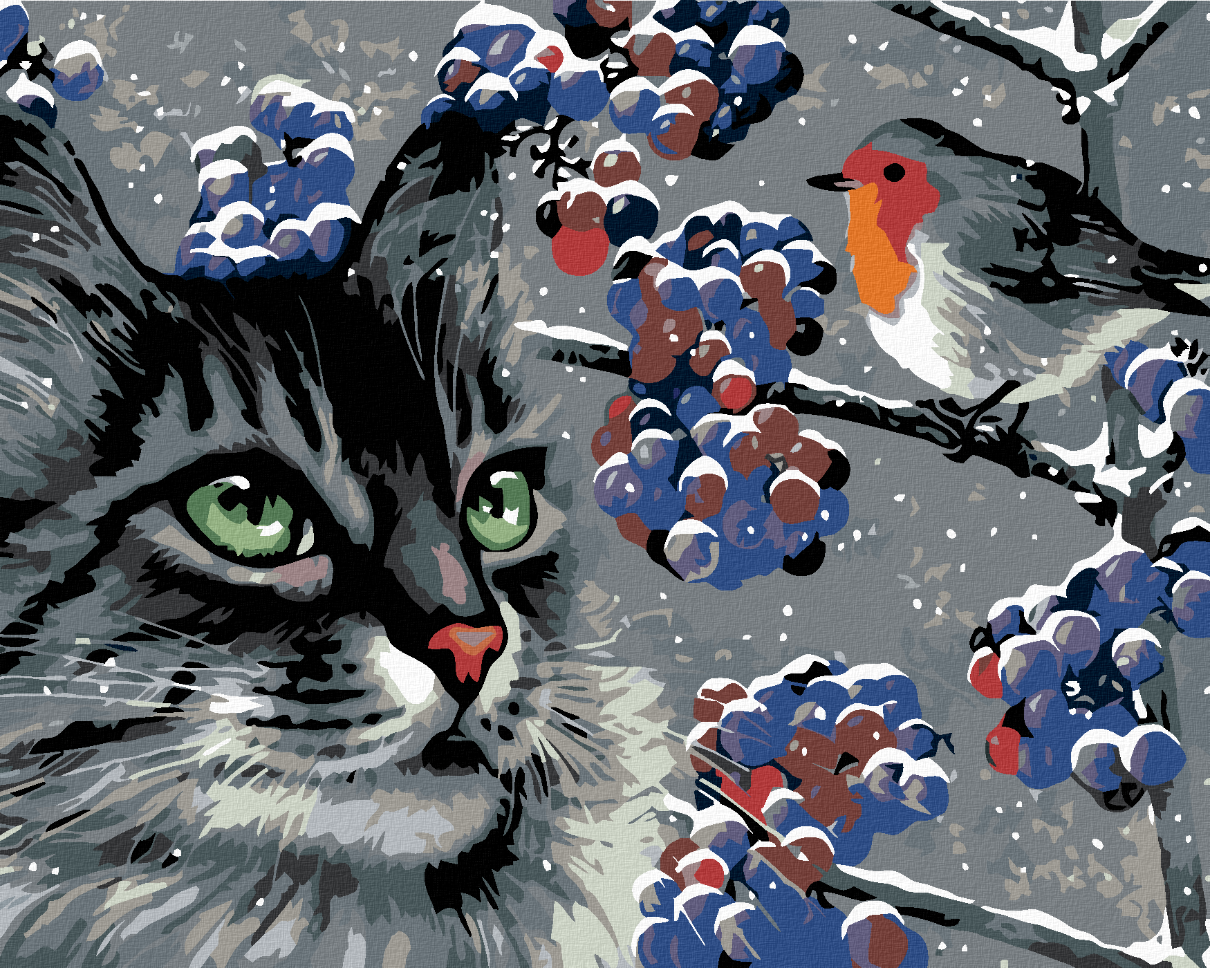 диамантени гоблени - ДЕБНЕЩА СИВА КОТКА И ПТИЦА