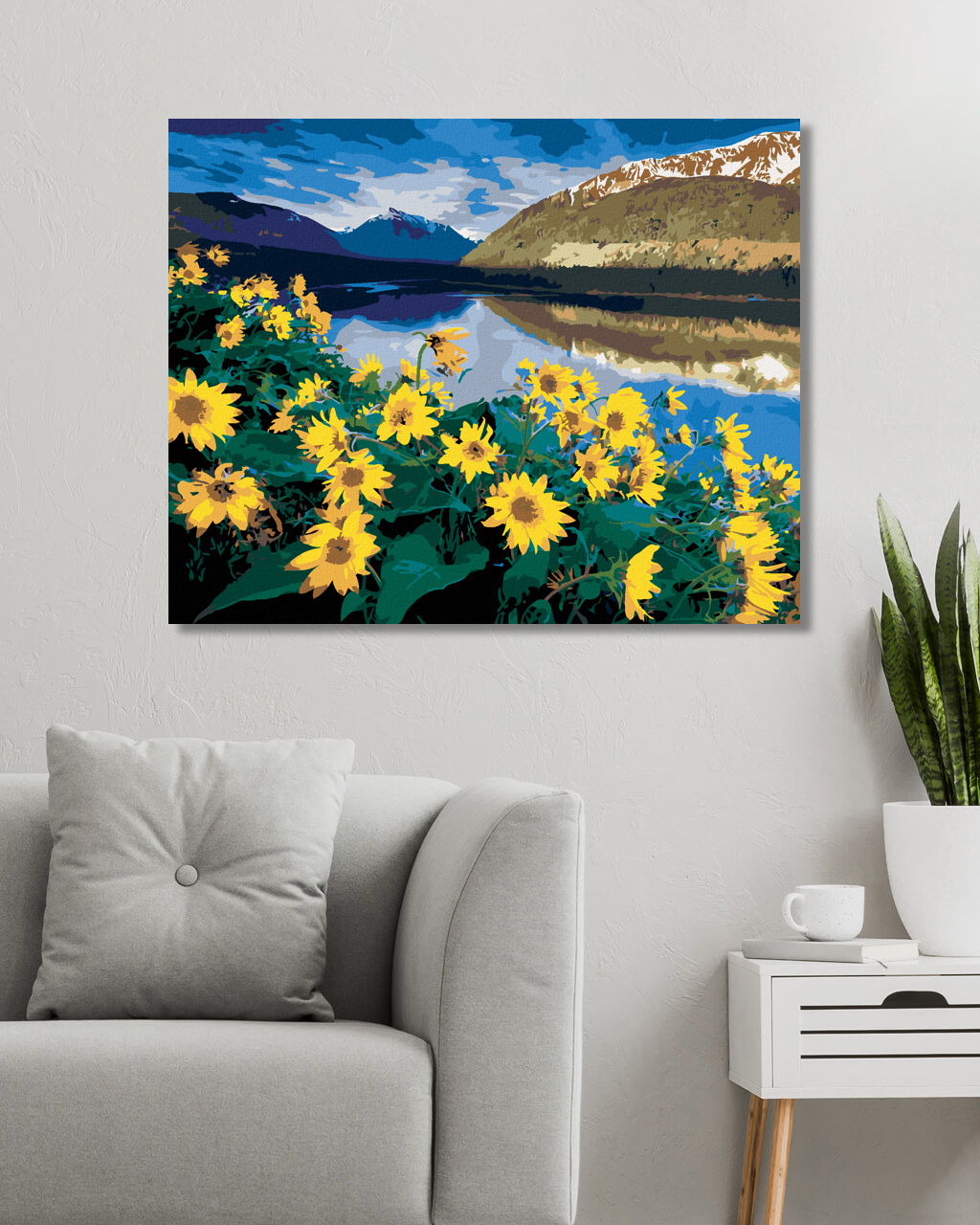диамантени гоблени - СЛЪНЧОГЛЕДИ КРАЙ ПЛАНИНСКО ЕЗЕРО (ДЕНИС ФРЕЙТС)