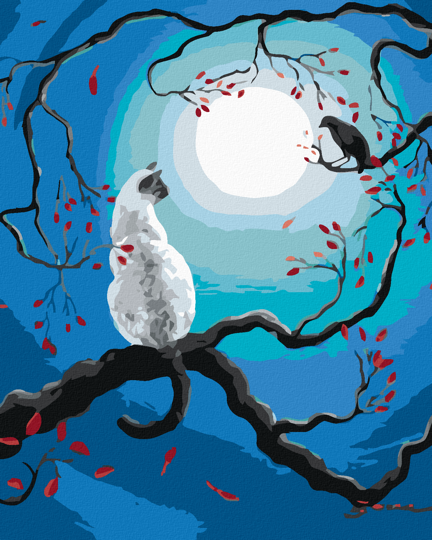 диамантени гоблени - БЯЛА КОТКА И ВРАНА ПРИ ПЪЛНОЛУНИЕ