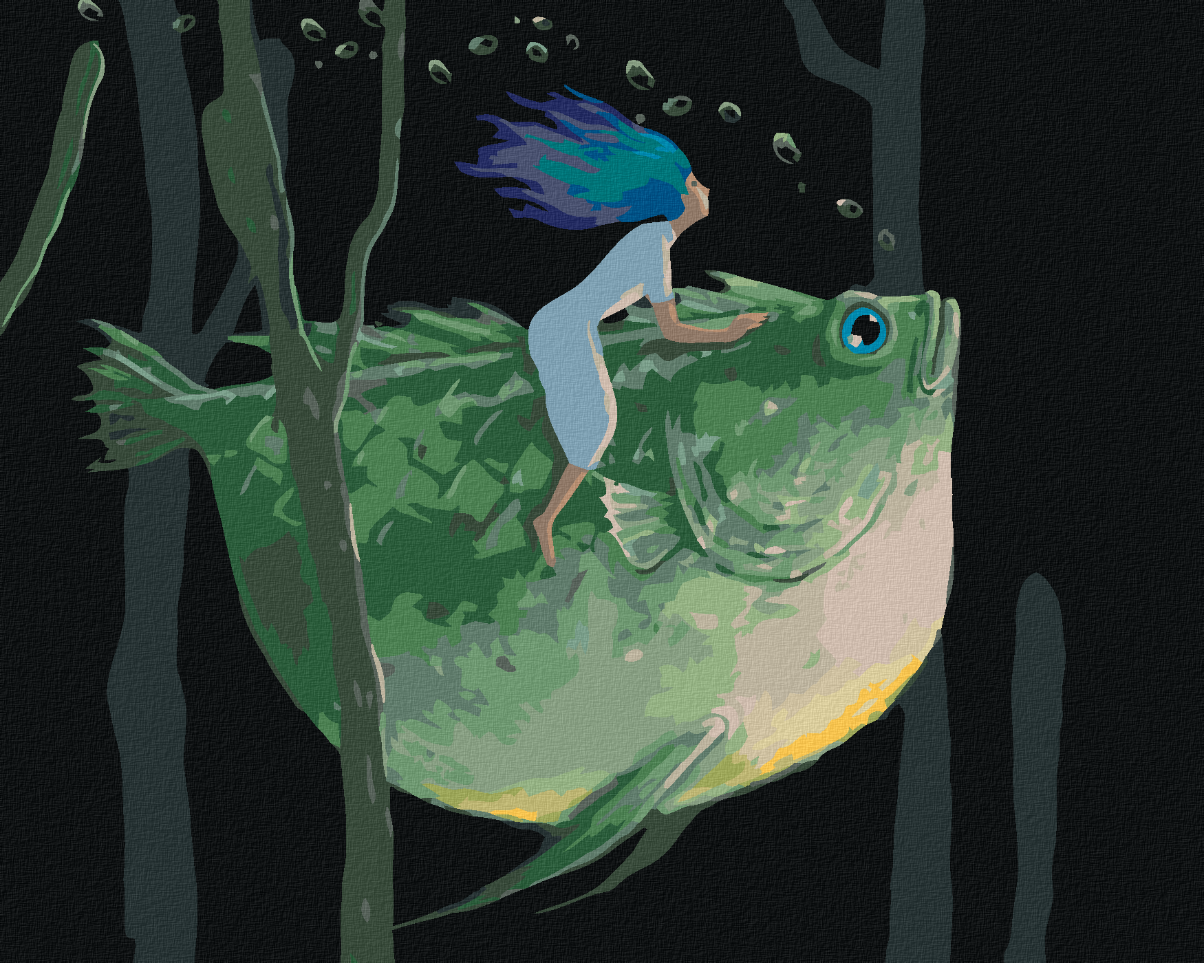 диамантени гоблени - ЖЕНА, СЕДНАЛА ВЪРХУ ГИГАНТСКА РИБА